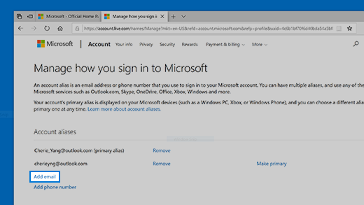 Follow the instructions to add a new email address or phone number to your Microsoft account aliases.