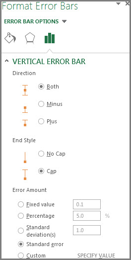 In the Format Error Bars pane, on the Error Bar Options tab, under Error Amount, click Custom, and then click Specify Value.
