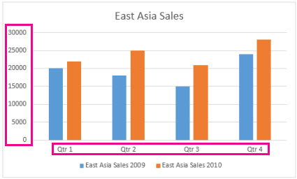Don't confuse the horizontal axis labels—Qtr 1, Qtr 2, Qtr 3, and Qtr 4, as shown below, with the legend labels below them—East Asia Sales 2009 and East Asia Sales 2010.