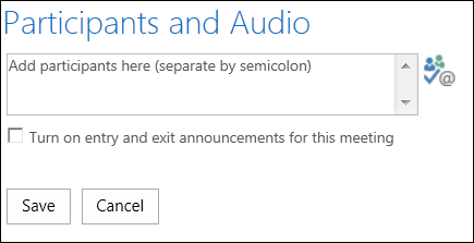 Under Participants and Audio, add the invitees’ names or email addresses, separated by a semicolon (;).