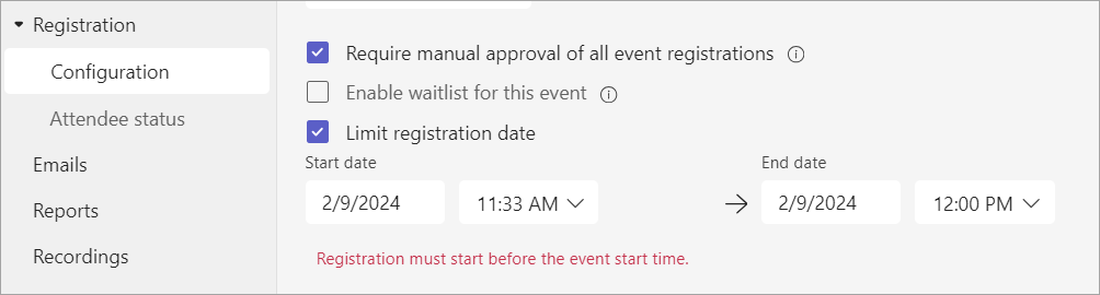 Note: Limiting registration start/end times is available as part of Teams Premium, an add-on license that provides additional features to make Teams meetings more personalized, intelligent, and secure. To get access to Teams Premium, contact your IT admin.