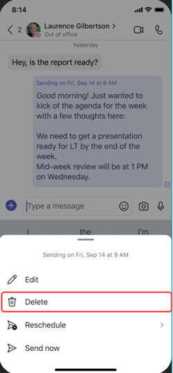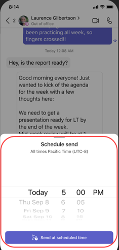 When you'd like to send a message in chat but the timing isn't quite right, schedule the message for a date and time that respects collaboration across locations and working hours. Scheduling the chat message will ensure it's sent at a date and time that you control.