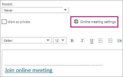 To view settings for who has access to the online meeting, who has to wait for you to admit them into the meeting, and who can present during the meeting, click Online meeting settings (just above the message area.