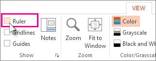 To show the rulers, on the View tab, select the Ruler box. To hide rulers, clear the Ruler box.