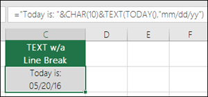 In this case, we used: ="Today is: "&CHAR(10)&TEXT(TODAY(),"mm/dd/yy")