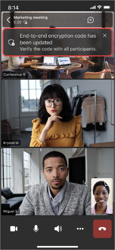 During an end-to-end encrypted meeting, features including recording, live captions, transcription, together mode, large meetings, large gallery view on desktop, and PSTN aren't available.
