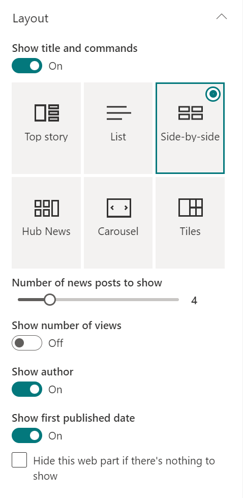 You can choose from different layouts for News. The default layout will depend on whether your site is a team site, a communication site, or part of a hub site.