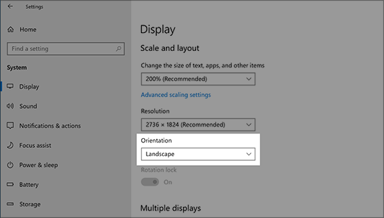 Select the Start button, then type settings. Select Settings > System > Display and choose a screen orientation from the drop-down list next to Display orientation.